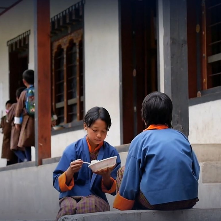 Tshering ist 12 Jahre alt. Sie lebt mit ihrem kleinen Bruder und einer Cousine ganz alleine in einer Hütte, nahe der Schule. Ihre Mutter muss arbeiten. Nur am Wochenende können die Kinder nach Hause, denn der Weg ins Heimatdorf ist weit.