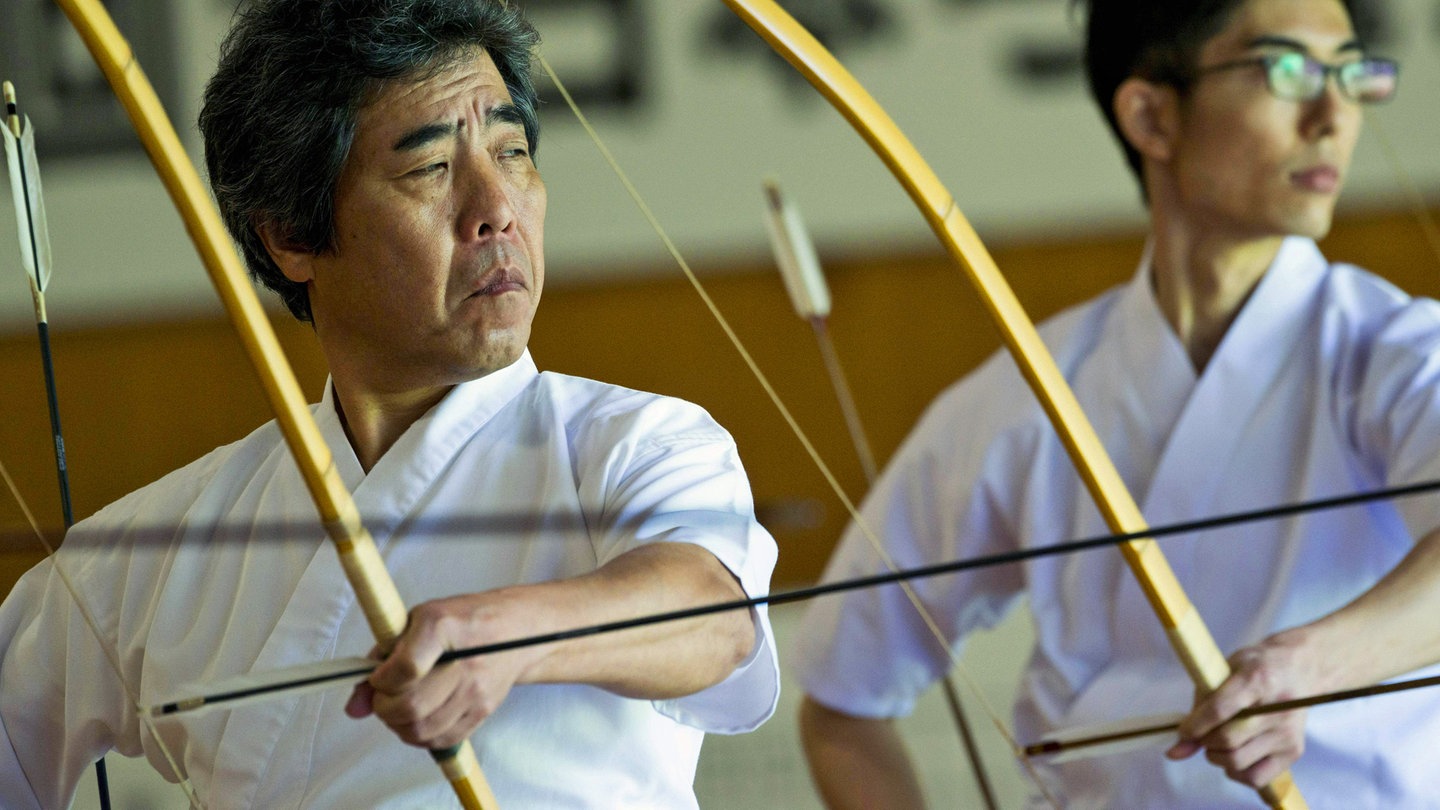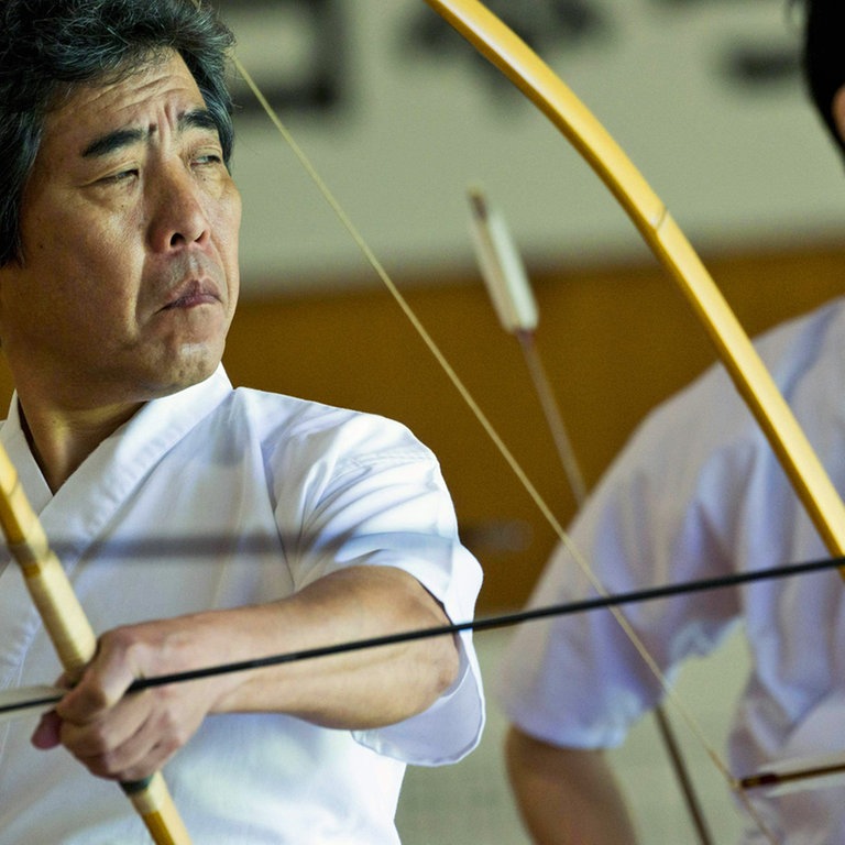 Im Dojo, dem japanischen Übungssaal, herrscht konzentrierte Stille. Langsam und fließend greifen die Männer und Frauen nach ihren Bögen und spannen die Sehnen. Sie üben sich in Kyudo, "dem Wege des Bogens", der klassischen Kriegskunst der Samurai.
