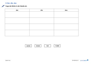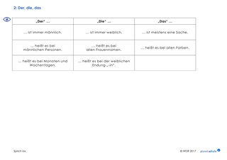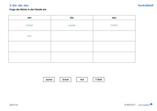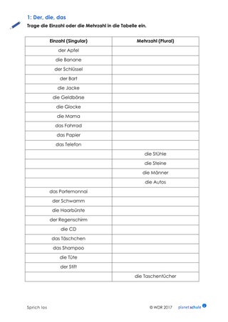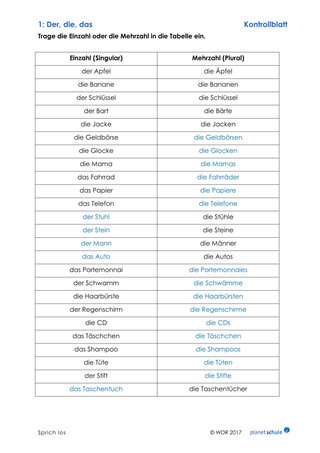 | Erarbeitung 1 | Filmbeobachtung, Singular bzw. Plural bilden | Einzel- oder Partnerarbeit | PC / Beamer / Lautsprecher, Film "Der, die das", Arbeits- & Kontrollblatt 1, Materialblatt 2 |