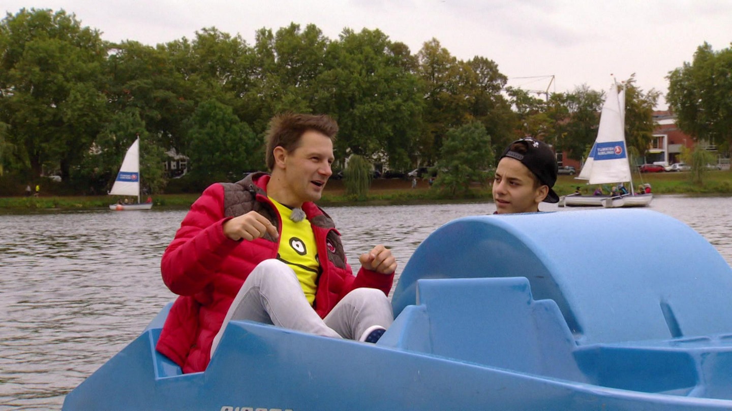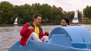 Iliya, der aus dem Iran stammt, und Moderator André Gatzke paddeln in Münster auf dem Aasee. Heute geht es um Fragewörter und besonders darum, welche Fragen man braucht, um jemanden kennen zu lernen.