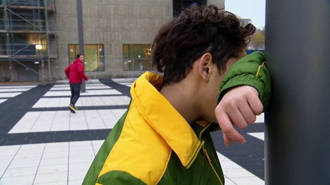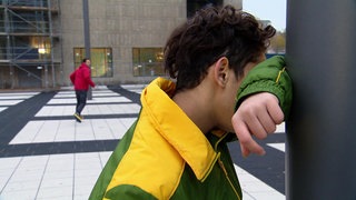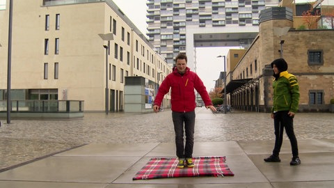In Köln ist Karneval! Auf der Straße sind buntgeschminkte Menschen in Kostümen unterwegs. Das sind erschwerte Bedingungen, um die Präpositionen kennenzulernen. André erklärt Iliya die Bedeutung von Präpositionen wie "hinter", "vor", "in" oder "neben".