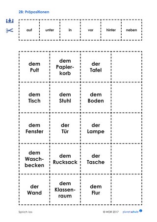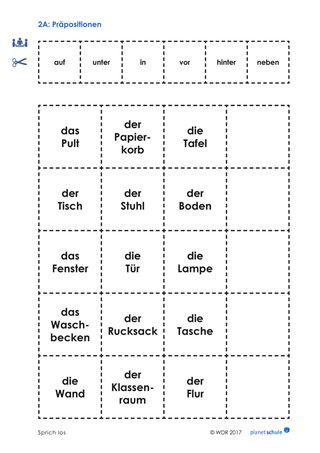 Die Klasse sieht den zweiten Teil des Films (ab Timecode 2:59 Min.) Anschließend spielen alle das Spiel von André und Iliya nach. Dafür schneidet die Lehrerin oder der Lehrer Worte beziehungsweise Wortkombinationen aus einem Materialblatt aus. Es handelt sich zum einen um Präpositionen und zum anderen um Substantive samt der zugehörigen Artikel. Er legt sie in getrennten Stapeln auf einen Tisch. Nun zieht jeweils ein Schüler eine Präposition und eine Substantiv-Artikel-Kombination (Beispiel: "hinter" und "dem Pult") und liest sie vor. Alle anderen Schülerinnen und Schüler müssen sich, so es denn geht, dort hinbegeben (in diesem Fall: hinter das Pult). Sollte man sich nicht dort hinbegeben können (Beispiel: in die Lampe) zieht der Schüler eine neue Präposition.