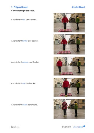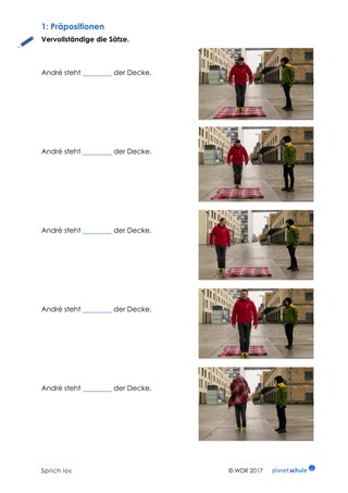 Die Schülerinnen und Schüler sehen den ersten Teil des Films (bis Timecode 2:58 Min.). Dabei oder anschließend üben sie die Verwendung von Präpositionen: Sie vervollständigen Sätze, die Screenshots aus dem Film beschreiben.