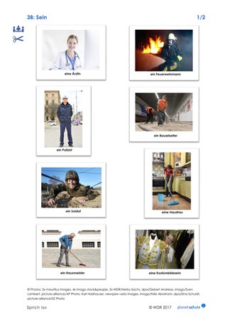 Die Schülerinnen und Schüler sehen den zweiten Teil des Films. Dann schließen sie sich zu Zweier- oder größeren Gruppen zusammen, basteln "Personalpronomen-Würfel" und schneiden Bildkarten aus. Immer abwechselnd würfeln sie, ziehen eine der verdeckt liegenden Karten und formulieren einen entsprechenden Satz (Beispiel: "Du bist eine Köchin"). Sie sollen sich gegenseitig korrigieren.