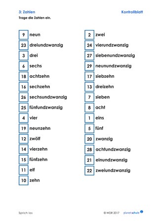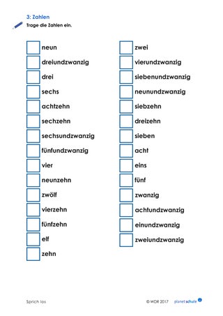 Die Schülerinnen und Schüler erhalten ausgeschriebene Zahlen und tragen die passenden Ziffern in Kästchen ein.