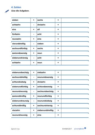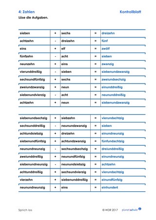 Die Schülerinnen und Schüler lösen Rechenaufgaben. Die Ergebnisse sollen sie nicht als Zahlen, sondern als deren ausgeschriebene Pendants notieren. Diese Übung kann gut als Partnerarbeit gelöst werden, indem immer abwechselnd gerechnet und geschrieben wird.