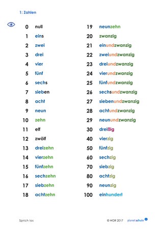 Als Unterstützung für die Arbeit mit dem Film erhalten die Schülerinnen und Schüler eine Liste, die den häufig verwendeten Zahlen ihre ausgeschriebenen Pendants gegenüberstellt.