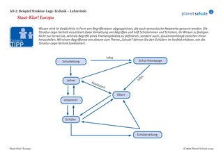Die Schülerinnen und Schüler sollen mithilfe der Struktur-Lege-Technik zwölf Begriffe zum Gesetzgebungsprozess in der EU und zur EU-Wahl miteinander in Beziehung bringen. Dabei werden Begriffe, die eng miteinander zu tun haben, nah zusammengelegt, andere weiter entfernt. Mit Pfeilen und Symbolen kann verdeutlicht werden, wie die Begriffe zusammenhängen. Auf AB 2 "Beispiel Struktur-Lege-Technik" verdeutlicht exemplarisch ein Begriffsnetz zum Thema Schule diesen Ansatz.