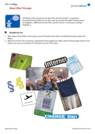 Die Schüler:innen erhalten eine Collage mit Screenshots aus dem Film. Zunächst notieren sie mit Bleistift um die Collage herum, was die einzelnen Bilder mit dem Thema EU zu tun haben könnten. Die Bilder aus der Collage sind bereits eine Hinführung zu den Themenbereichen EU-Gesetze und Europawahl, die im nächsten Arbeitsschritt geklärt werden sollen. Dann schaut die Klasse den Film gemeinsam an. Dabei überprüfen die Schülerinnen und Schüler ihre Vermutungen. Was falsch war, wird ausradiert und neu eingetragen.