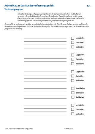 Als Einstieg ins Thema machen sich die Schülerinnen und Schüler vor dem Film Gedanken zu den fünf Verfassungsorganen und ihren Aufgaben. Auf Arbeitsblatt 1 notieren sie dazu Stichworte und füllen eigene Wissenslücken durch selbstständige Recherche im Internet.