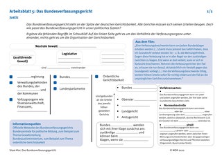 Auf Arbeitsblatt 4 beschäftigen sich die Schülerinnen und Schüler mit den Grundrechten in der Verfassung der Bundesrepublik Deutschland. Sie ordnen Menschen- und Bürgerrechte dem entsprechenden Artikel des Grundgesetzes zu und schreiben anschließend einen kurzen Text über einen Artikel ihrer Wahl. Dabei geht es in essayistisch-freier Form um die Bedeutung des dort festgeschriebenen Rechts. Die Schülerinnen und Schüler lernen Inhalt und Sinn der Grundrechte kennen, die jeder Bürger beim Bundesverfassungsgericht einklagen kann.
