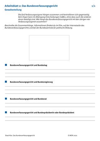 Das Arbeitsblatt 2 steigt tiefer in das System gegenseitiger Kontrolle der Verfassungsorgane ein, das im Film mit dem Bild des Mobiles illustriert wird. Die Schülerinnen und Schüler beschreiben, in welchem Verhältnis Bundesrat, Bundestag, Bundespräsident und Bundesregierung zum Bundesverfassungsgericht stehen. Dabei wird deutlich: Das Bundesverfassungsgericht agiert als gleichwertiges Verfassungsorgan mit den anderen Institutionen auf Augenhöhe und übt eine wichtige Kontrollfunktion in unserer Demokratie aus.