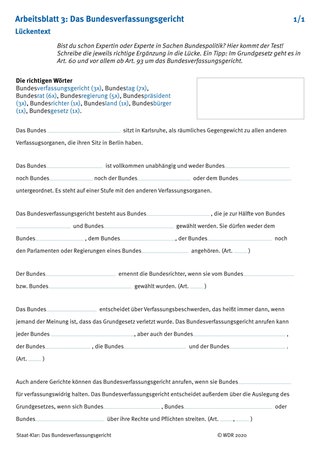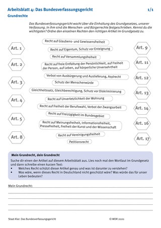 Auf Arbeitsblatt 4 beschäftigen sich die Schülerinnen und Schüler mit den Grundrechten in der Verfassung der Bundesrepublik Deutschland. Sie ordnen Menschen- und Bürgerrechte dem entsprechenden Artikel des Grundgesetzes zu und schreiben anschließend einen kurzen Text über einen Artikel ihrer Wahl. Dabei geht es in essayistisch-freier Form um die Bedeutung des dort festgeschriebenen Rechts. Die Schülerinnen und Schüler lernen Inhalt und Sinn der Grundrechte kennen, die jeder Bürger beim Bundesverfassungsgericht einklagen kann.