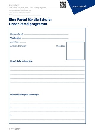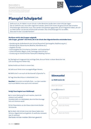 Material: Materialblatt 1: Planspiel Schulpartei; Arbeitsblatt 2: Eine Partei für die Schule; Plakatpapier, farbiges Papier, Marker, Farben, Kleber; Stimmzettel mit den Namen der drei Parteien entsprechend der Schüler:innenanzahl