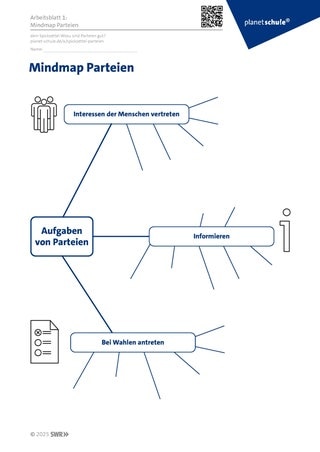 Gemeinsames Ausfüllen der Mindmap (Arbeitsblatt 1) zum Thema „Aufgaben von Parteien“ im Plenum: Die drei Bereiche – Interessen vertreten, Informieren, Wahlen – werden am Whiteboard angeschrieben/an die Pinnwand geheftet. Die Schüler:innen ordnen ihre Äußerungen vom Beginn der Stunde den drei Bereichen zu und können weitere Ideen ergänzen, die sie nach dem Anschauen des Films haben. Mindmap sichern (z.B. speichern).
