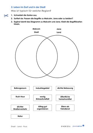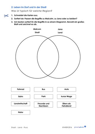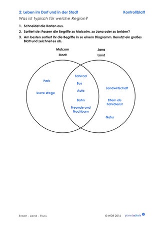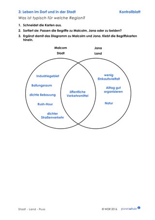 Die Schüler schauen den Film bis zum Ende. Sie erhalten zunächst Arbeitsblatt 2 "Typisch für die Region" mit Begriffskärtchen zu Bildern und Text aus dem Film. Die Kärtchen werden ausgeschnitten und in einem Diagramm dem Leben in der Stadt bzw. dem Leben auf dem Dorf zugeordnet. Einige Begriffe passen zum Leben in beiden Regionen. Sie werden der Schnittmenge im Diagramm zugeordnet.