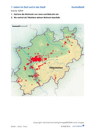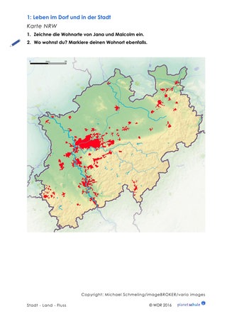 Die Schüler schauen zunächst den Anfang des Films (Timecode 0:00 – 3:58 Min.) an. Die Lehrkraft fragt nach, welcher der beiden Protagonisten wo lebt. Die Orte werden an die Tafel geschrieben. Die Schüler erhalten anschließend Arbeitsblatt 1 "Karte NRW", mit einer schematischen Landkarte von Nordrhein-Westfalen. Darin zeichnen sie mit Hilfe einer NRW-Karte bzw. mit einem Atlas die Wohnorte von Malcom und Jana sowie ihren eigenen Wohnort farbig ein. Diese Karte bietet eine erste räumliche Orientierung.