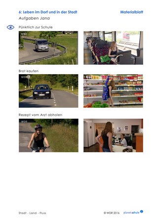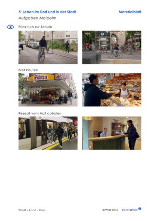 Auf zwei Materialblättern wird mit Screenshots dokumentiert, wie Jana und Malcom ihre Aufgaben erledigt haben. Die Screenshots zeigen Malcom und Jana in vergleichbaren Situationen, zum Beispiel beim Bäcker. So haben die Schüler die Filmsituationen noch einmal vor Augen, der Transfer zur eigenen Lebenssituation fällt leichter.