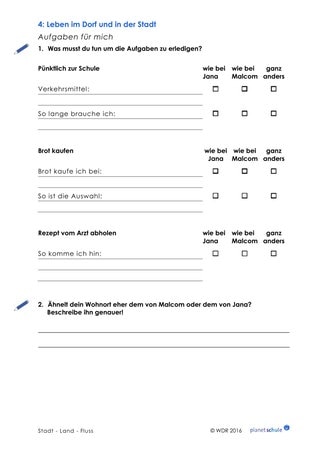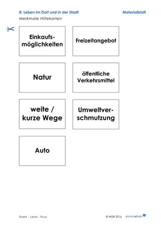 | Vertiefung 2 | Bewertung Lebenssituation Stadt / Land | Einzel- und Gruppenarbeit | Arbeitsblatt 7, Materialblatt 8 |