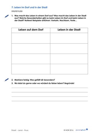 Die Schüler erhalten Arbeitsblatt 7 "Merkmale". In einer Tabelle sammeln sie Vor- und Nachteile für das Leben in Stadt und Dorf. Sie überlegen zunächst in Einzelarbeit und dann in kleinen Gruppen. Anschließend markieren sie, was ihnen besonders gefällt, und begründen, wo sie selbst warum am liebsten wohnen möchten.