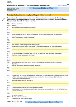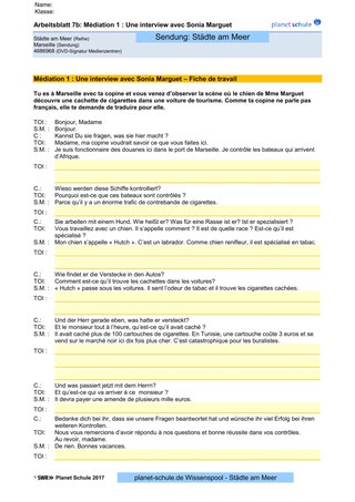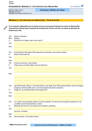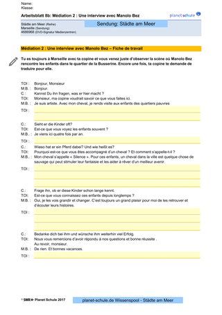 Arbeitsblatt 7a, 7b / 8a, 8b : Médiation – Interviews avec Sonia Marguet et Manolo Bez: Zu den beiden Interviews mit Sonia Marguet und Manolo Bez gibt es hier jeweils zwei unterschiedlich anspruchsvolle Aufgabenvorschläge, um eine Differenzierung zu ermöglichen. In der Regel sollte diese Mediation in Dreiergruppen erfolgen und in jeder Gruppe auch mehrmals in wechselnden Rollen durchgespielt werden. Falls in Vierergruppen gearbeitet wird, kann ein Mitglied der Gruppe das Lösungsblatt erhalten und die Korrektheit der Aussagen verifizieren. Die Sprachmittlungen können direkt in Anschluss an die jeweilige Sequenz oder nach der Erarbeitung des Films durchgeführt werden.