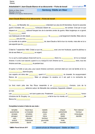Arbeitsblatt 4: Jean-Claude Bianco et sa découverte: Der Lückentext kann direkt nach der inhaltlichen Aufarbeitung der Sequenz oder im Anschluss an den ganzen Film vorgelegt werden. Als Differenzierungsmöglichkeit bietet es sich an, für sehr gute Schülerinnen und Schüler auf die Bereitstellung der Wörterliste zu verzichten. Auch eine mündliche Vervollständigung des Lückentextes in Partnerarbeit ist möglich, wobei der/die Kontrollierende die Lösung vor Augen haben sollte (zum Beispiel als als Overhead-Projektion).