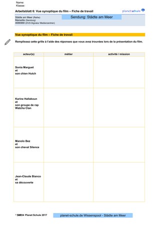 Arbeitsblatt 6: Vue synoptique du film: Die Schülerinnen und Schüler füllen anhand ihrer Notizen das vorgegebene Raster in Einzel- oder Partnerarbeit aus (sukzessive entweder nach der jeweiligen Sequenz oder nach dem Film als Wiederholungsphase). Mithilfe dieses Rasters könnte dann ein Resümee oder ein Werbetext für den gesamten Film erstellt werden.