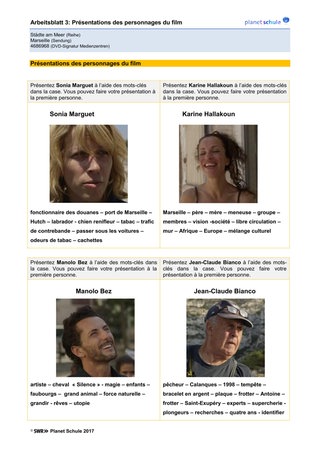 Arbeitsblatt 3 : Présentations des personnages du film: Diese Rollenkarten können an die Klasse verteilt werden. Die Vorstellung der einzelnen Personen kann entweder unmittelbar nach der Erarbeitung der entsprechenden Sequenz im Plenum erfolgen oder mit mehr Schüleraktivität in Kleingruppen durchgeführt werden. Zur stärkeren Identifikation sollten die Präsentationen in der ersten Person erfolgen. Weitere Möglichkeiten wären Interviews, eine Podiumsdiskussion oder eine Talkshow als wiederholende und zusammenfassende Anschlussaktivität nach der Behandlung des gesamten Films.