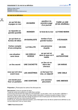 Arbeitsblatt 5 : Un mot et sa définition: Die Wörter und deren Definition sollten mehrfach kopiert und dann auseinandergeschnitten und in Form eines Memo-Spiels in Partnerarbeit oder in Kleingruppen geübt werden. Ausgewählt wurden hier solche Vokabeln, denen eine eingängige Definition zugeordnet werden kann. Eine genaue Erläuterung der Vorgehensweise befindet sich auf dem Arbeitsblatt. Da das Spiel den Schülerinnen und Schülern bekannt sein dürfte, bietet sich auch eine spontane Erklärung der Regeln in der Zielsprache an.