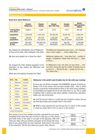 | Erarbeitung II (placemat activity) | Nachdem festgestellt und diskutiert worden ist, dass Melbourne im Sommer 2016 zum sechsten Male hintereinander zur lebenswertesten Stadt gewählt worden ist, setzen sich die Schüler/-innen im Rahmen der kooperativen Lernform eines placemat mit der Frage nach der Wohnqualität in einer Großstadt oder auf dem Lande auseinander. Dabei sollen sie Aspekte wie Stabilität, Sicherheit, Infrastruktur, Bildung und Erziehung, Gesundheitswesen sowie Umweltbelastung berücksichtigen. Form groups and start working on a placemat. Find out what is most important for you, according to whether you like to live in a big city or rather in the country. | Arbeitsblatt 2: Melbourne - Facts |