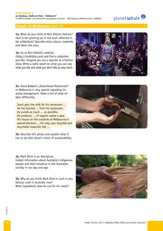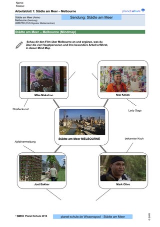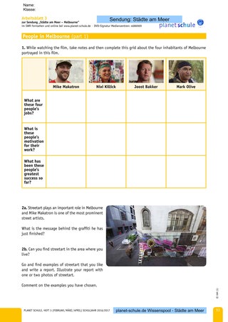 | Präsentation des Films (while watching activity) | Während der Vorführung des Films notieren sich die Schüler/-innen wichtige Hinweise über die Stadt Melbourne und insbesondere über die vier porträtierten Bewohner dieser australischen Großstadt. Um die Schüler/-innen evtl. nicht zu überfordern, können vier Gruppen gebildet werden, die sich die Beobachtungsaufträge teilen und sich jeweils nur über eine Person Notizen machen. Anschließend wird die tabellarische Übersicht ergänzt und verglichen. While watching the film take notes. | Film Arbeitsblatt 3: People in Melbourne (part 1) Arbeitsblatt 4: People in Melbourne (part 2) |