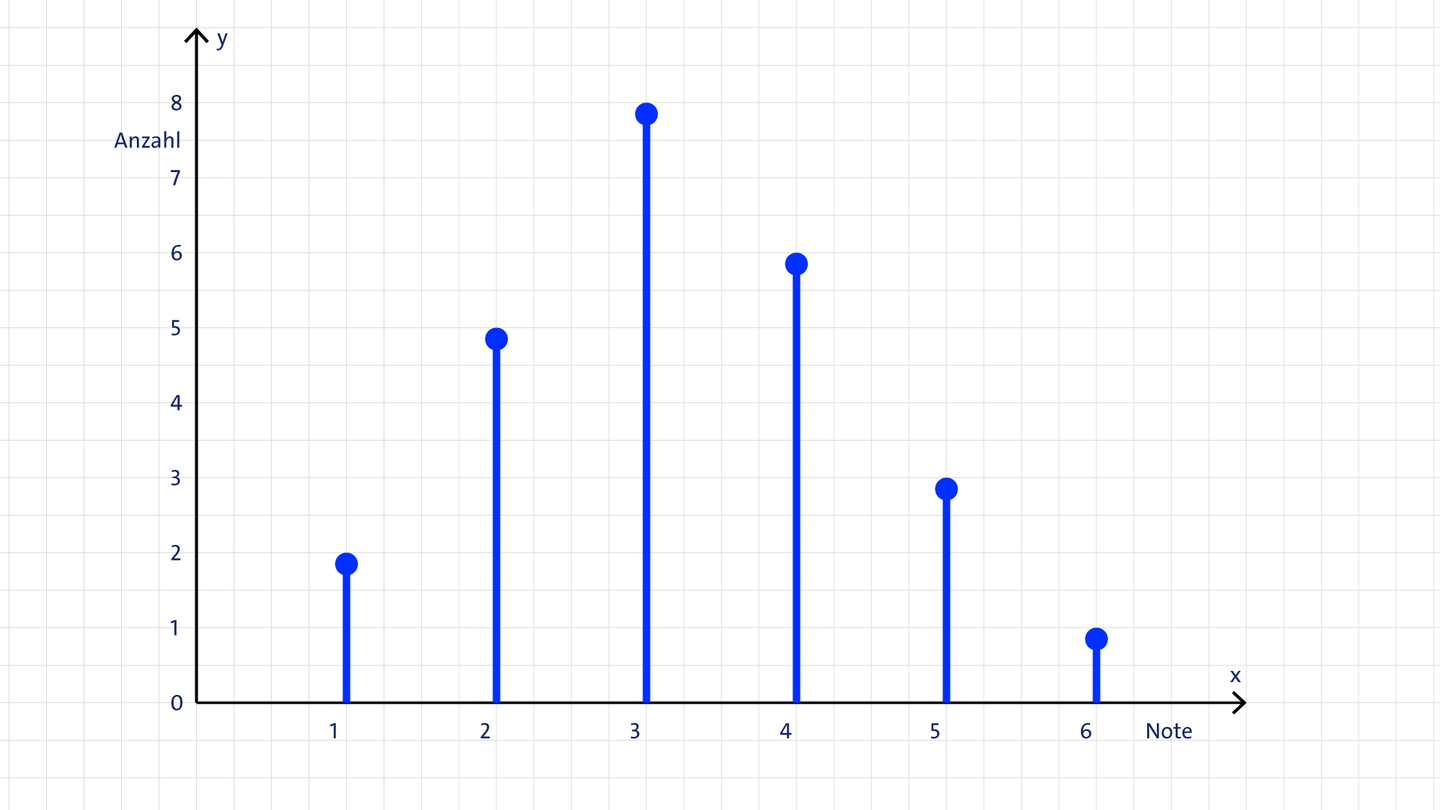 Beispiel: Häufigkeit von Mathematiknoten aller 11. Klassen der Schule. Im Stabdiagramm wird jede Note als dünner Strich dargestellt, die Höhe entspricht der Anzahl.