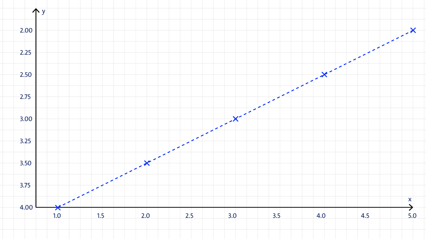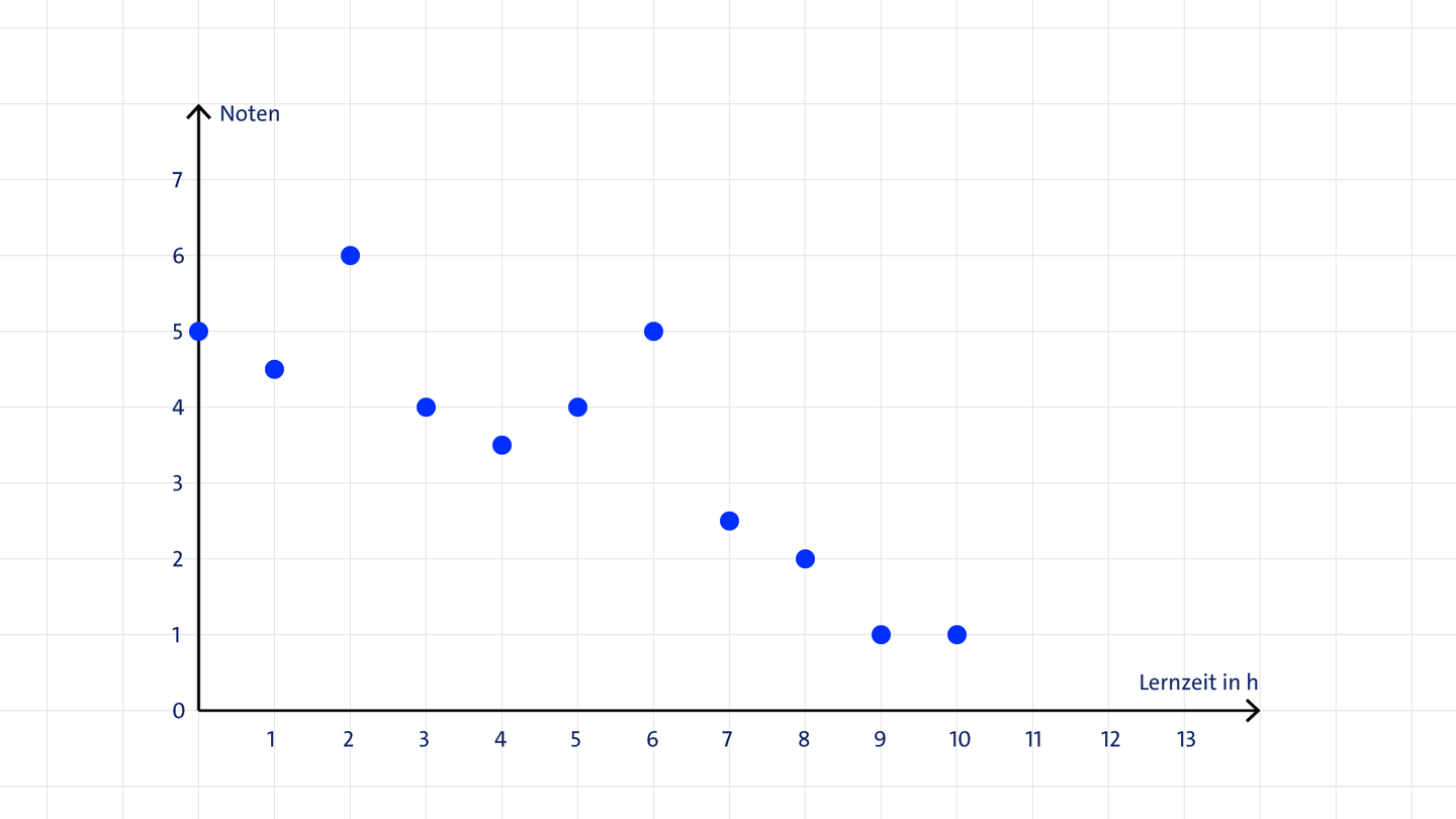 Beispiel: Zusammenhang zwischen der Lernzeit für eine Schulaufgabe (Zeit in Stunden) auf der horizontalen Achse und der erzielten Note (Noten zwischen 1 und 6) auf der vertikalen Achse.