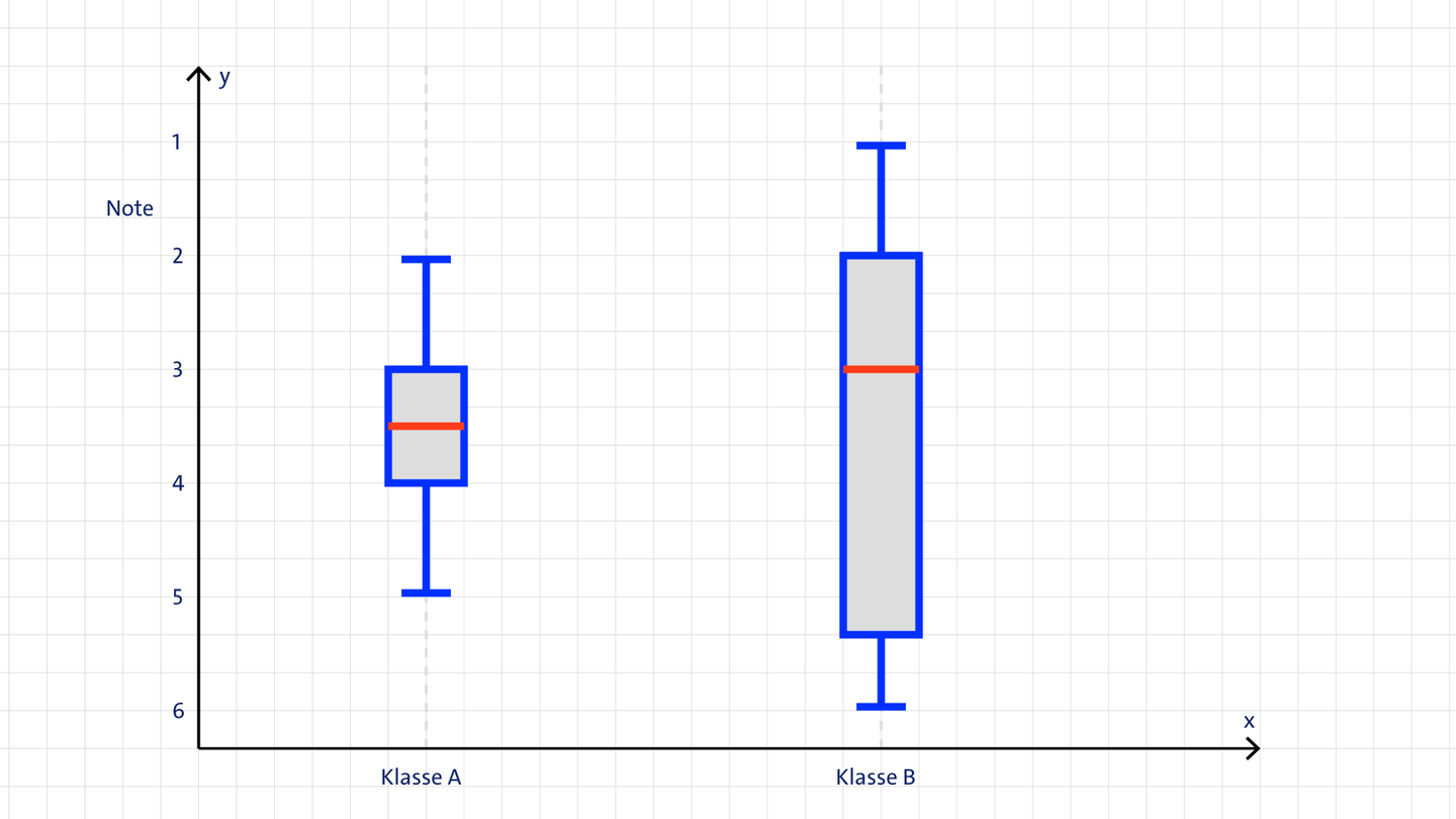 Ein Mathematiklehrer stellt die Prüfungsnoten seiner zwei Klassen in einem Boxplot dar. Analysiere die Daten.