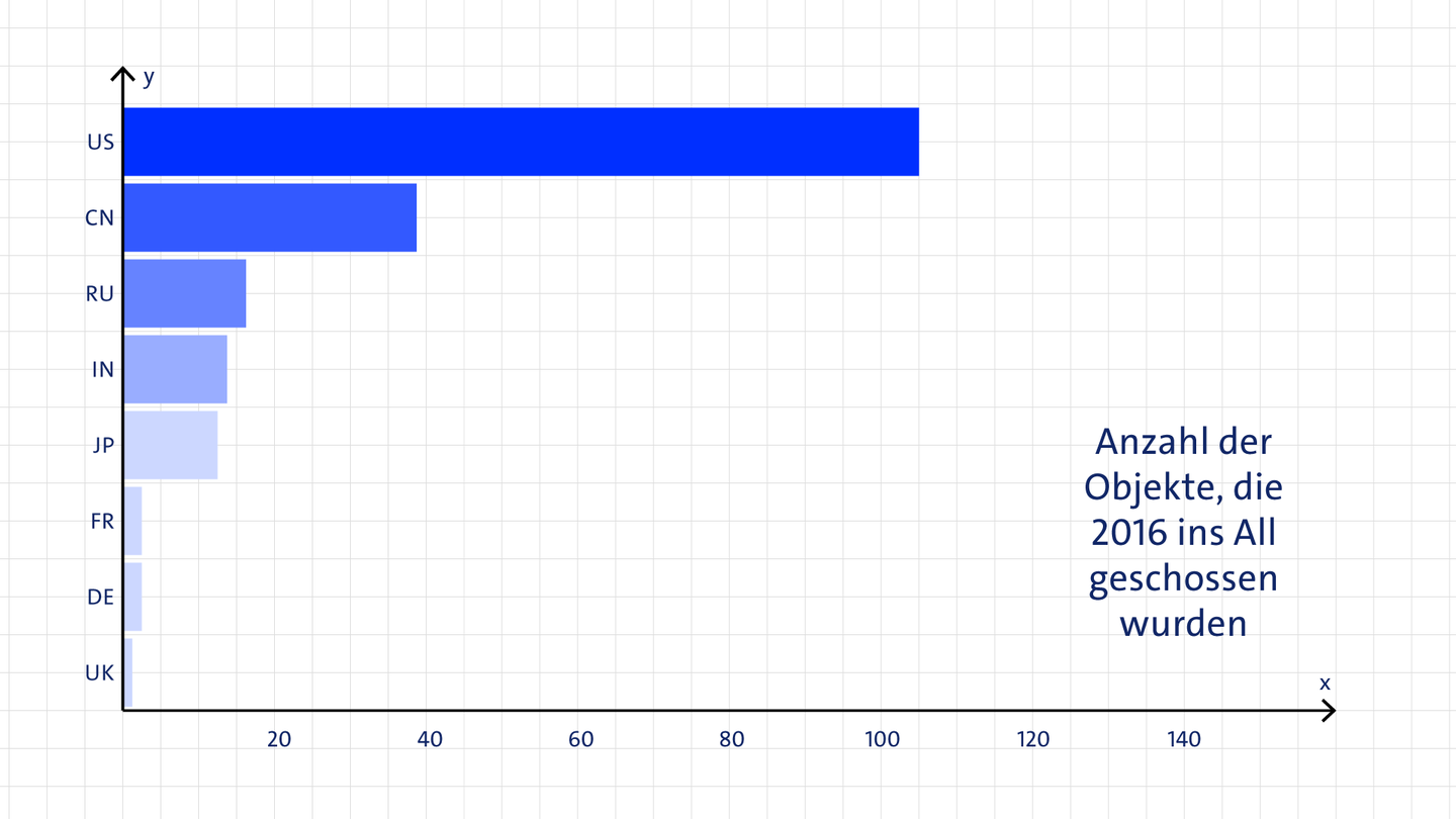 Beispiel: Anzahl der Objekte, die 2016 ins All geschossen worden. Die Balken stehen für die beteiligten Länder, die Länge zeigt die Anzahl der Objekte an.