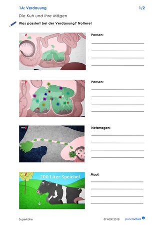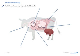 Der Verdauungsvorgang des Rinds als Wiederkäuer ist für die Lernenden äußerst komplex. In dem Film "Die Superkühe: Ein Kuhleben", Timecode 2:20 – 4:10 Min., wird der Vorgang mit einer Animation verständlich erklärt. Mit Arbeitsblatt 1 "Die Kuh und ihre Mägen" lassen sich die Inhalte sichern. Danach beschriften die Lernenden eine Skizze der Kuh und ihrer Mägen mit den korrekten Begriffen.