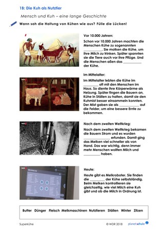 Die Kuh als Nutztier hat eine lange Geschichte. Mit einem Filmausschnitt aus "Die Superkühe: Ein Kuhleben", Timecode 5:55 – 7:40 Min., erfassen die Schülerinnen und Schüler die historische Entwicklung und sichern diese mithilfe von Arbeitsblatt 1.