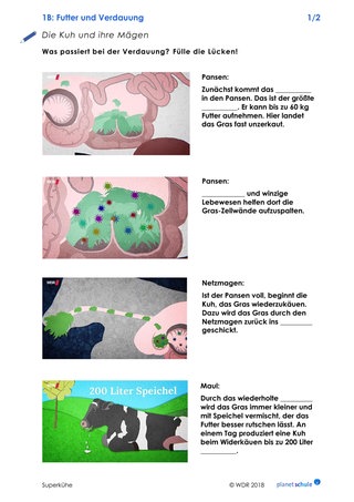 Was passiert während der Verdauung im Körper der Kuh? Lückentext zu den jeweiligen Stationen ausfüllen.