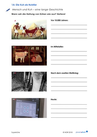 Die Kuh als Nutztier hat eine lange Geschichte. Mit einem Filmausschnitt aus "Die Superkühe: Ein Kuhleben", Timecode 5:55 – 7:40 Min., erfassen die Schülerinnen und Schüler die historische Entwicklung und sichern diese mithilfe von Arbeitsblatt 1.