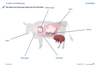 Der Verdauungsvorgang des Rinds als Wiederkäuer ist für die Lernenden äußerst komplex. In dem Film "Die Superkühe: Ein Kuhleben", Timecode 2:20 – 4:10 Min., wird der Vorgang mit einer Animation verständlich erklärt. Mit Arbeitsblatt 1 "Die Kuh und ihre Mägen" lassen sich die Inhalte sichern. Danach beschriften die Lernenden eine Skizze der Kuh und ihrer Mägen mit den korrekten Begriffen.