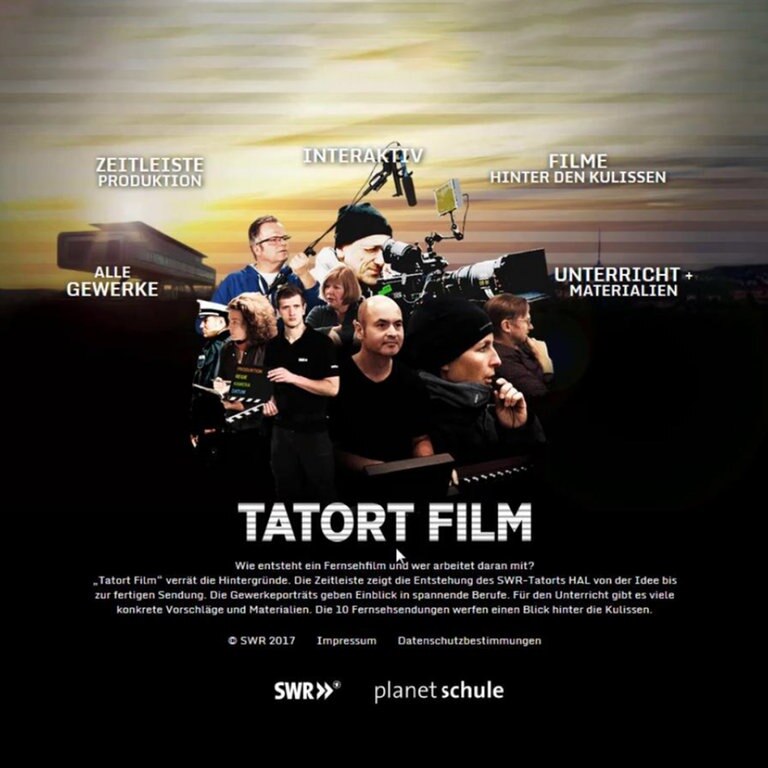 Auf der Plattform "Tatort Film" findet man alles über die Fernsehfilm-Produktion HAL und die beteiligten Berufe: Über die Zeitleiste kann man den Entstehungsprozess von der Idee bis zur Ausstrahlung verfolgen. Filmclips, Interviews, Bilder und Texte verraten Einzelheiten zu jedem Produktionsschritt. Über die Gewerke-Porträts findet man heraus, wer was beim Film macht und wie man diese Berufe erlernt, und mit drei interaktiven Tools kann man Schnitt, Farbkorrektur und die Wirkung von Filmmusik ausprobieren.