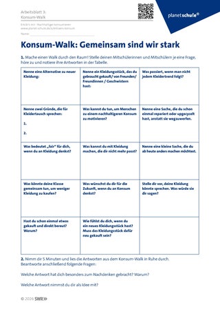 Der Konsum steigt rapide an – gefördert durch günstige Ultra Fast Fashion. Doch was kann man dagegen tun? In der Klasse werden erste Ideen und Gedanken gesammelt. Anschließend wird Arbeitsblatt 3 – Konsum-Walk bearbeitet. Dazu laufen die Schülerinnen und Schüler mit Arbeitsblatt und Stift durch den Raum und befragen sich gegenseitig (Teil 1). Um die Antworten im Anschluss zu hinterfragen, bearbeiten die Schülerinnen und Schüler den zweiten Teil des Arbeitsblatts in Einzelarbeit.
