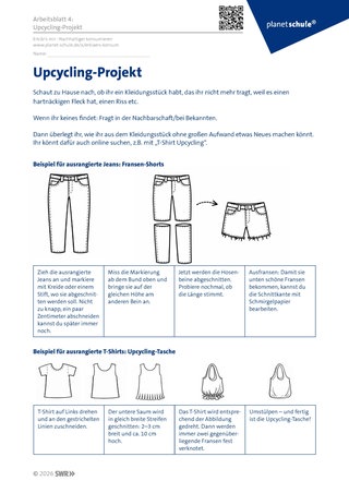 Material: altes T-Shirt, alte Jeans, Scheren, Arbeitsblatt 4: „Upcycling-Projekt“, Kärtchen, Stifte