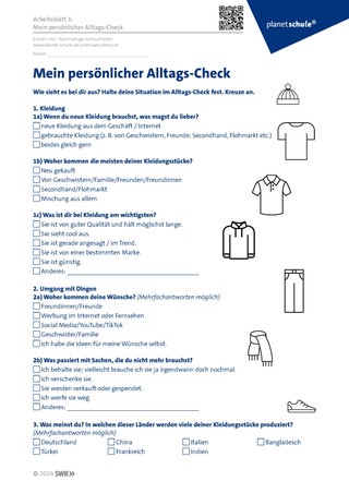 Zum Einstieg in das Thema setzen sich die Schülerinnen und Schüler auf Arbeitsblatt 1 „Mein persönlicher Alltags-Check“ mit ihrem Konsumverhalten auseinander. Einzelne Punkte können anschließend in der Klasse besprochen werden. Im Vordergrund steht jedoch das Ziel, sich mit persönlichen Konsum- und Kaufentscheidungen auseinanderzusetzen.