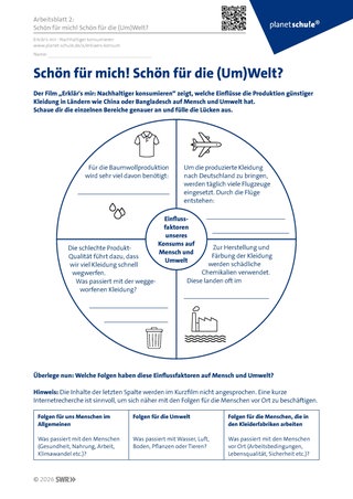 Anschließend wird ein Klassen-Kleidercheck durchgeführt: Alle untersuchen gegenseitig ihre Kleideretiketten und sammeln die Herkunftsländer. Die Länder mit den meisten Nennungen werden auf einer Weltkarte gesucht. Wie weit sind die Länder von Deutschland entfernt? Welche Auswirkungen für Mensch und Umwelt kann die Produktion in diesen Ländern haben? In Partnerarbeit wird Arbeitsblatt 2: „Schön für mich! Schön für die (Um)Welt?“ bearbeitet (ggf. etwas Zeit für eine kurze Internetrecherche einplanen) und anschließend im Plenum besprochen.