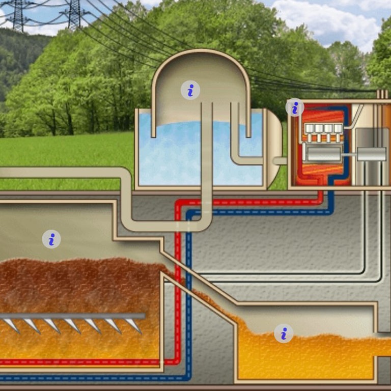 In der Animation kann man sich den Aufbau einer Biogasanlage ansehen und mehr über ihre Funktionsweise einer solchen Anlage lernen. Zu sehen sind alle Bestandteile der Biogasanlage, von der Vorgrube über den Fermenter und den Gasspeicher bis hin zum Blockheizkraftwerk und dem Güllelager. Durch Anklicken des Informationssymbols "i" kann man sich genaue Beschreibungen der einzelnen Elemente anzeigen lassen.
