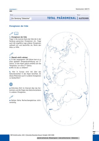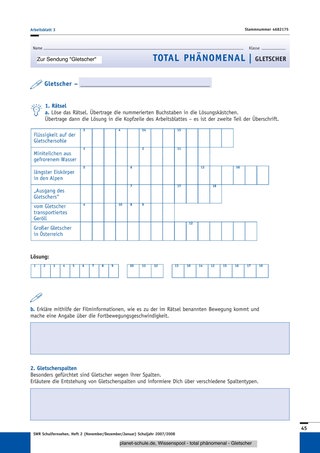 a. Bevor die Sendung gezeigt wird, erhalten die Schüler Arbeitsaufträge. Die Entstehung und Arbeit eines Gletschers soll mit Arbeitsblatt 3 bearbeitet werden. Daher erhalten alle das Arbeitsblatt und informieren sich auf dem Blatt über die Filminhalte, auf die sie besonders achten sollen. Darüber hinaus wird die Klasse in drei Gruppen aufgeteilt, die arbeitsteilig auf folgende Filminformationen achten:
