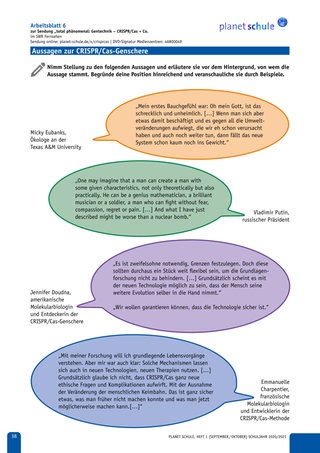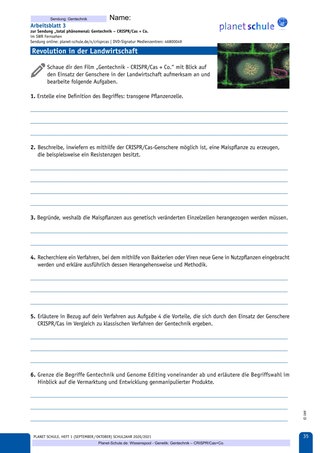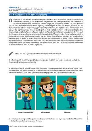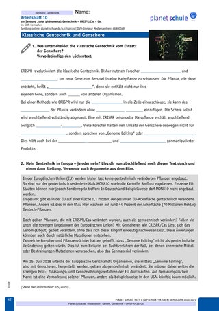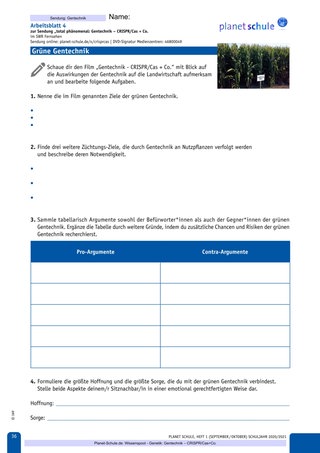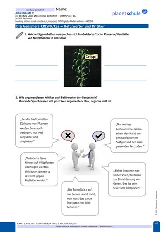 Setzt man den Schwerpunkt auf den konkreten Einsatz der Genschere in der Landwirtschaft, so dient das Arbeitsblatt 3 der Erarbeitung. Arbeitsblatt 4 nimmt die grüne Gentechnik im Allgemeinen in den Fokus. Arbeitsblatt 5 dient zur kontroversen Auseinandersetzung mit den Milliardengeschäften von Großkonzernen wie Bayer/Monsanto in Bezug auf den Einsatz von Glyphosat. Zitate und Aussagen von Wissenschaftlern und berühmten Persönlichkeiten zum Einsatz der CRISPR/Cas-Schere zeigen Möglichkeiten und Grenzen auf und lassen Raum für facettenreiche Diskurse. Soll der Schwerpunkt der Stunde auf den Anwendungen der Genschere in der Grundlagenforschung liegen, so kann Arbeitsblatt 7 herangezogen werden.