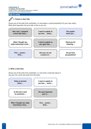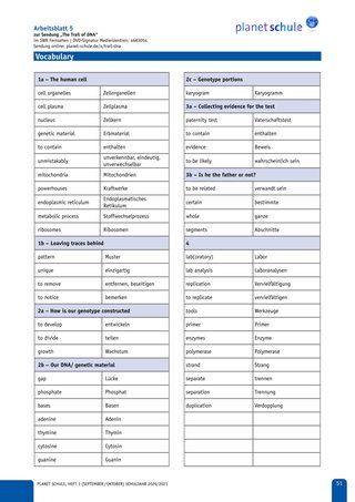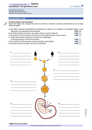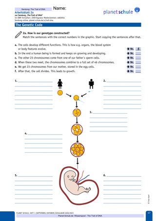 | Erarbeitungs-phase II | Lehrkraft zeigt Abschnitt 2 des Films – The Genetic Code. Lesen des Arbeitsauftrags und die Zuordnung der Textabschnitte erfolgen gemeinsam. Schüler*innen schreiben Texte in Eigenarbeit ab. Schüler*innen bearbeiten Task 2a – 2c und vergleichen Lösungen mit einem Aushang. | Plenum, Einzelarbeit, Partnerarbeit | Film TC 02:00–03:48, Arbeitsblatt 2 und 3, Vokabelblatt, Lösungen |