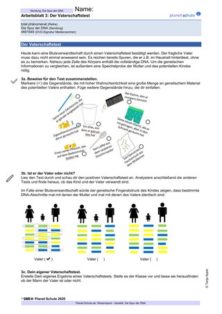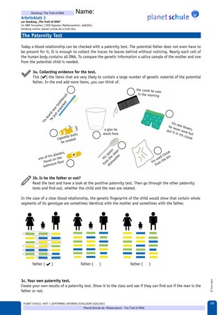 | Erarbeitungs-phase III | Lehrkraft zeigt Abschnitt 3 des Films – The Paternity Test. Klasse liest gemeinsam den Arbeitsauftrag und die Textabschnitte, die zugeordnet werden sollen. Schüler*innen bearbeiten Task 3a – 3b und vergleichen Lösungen mit einem Aushang. | Partnerarbeit | Film TC 03:48–05:21, Arbeitsblatt 4, Vokabelblatt, Lösungen |